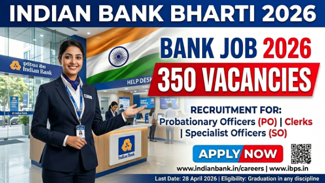 Indian Bank Recruitment 2026 – Apply for 350 Specialist Officer posts. Check eligibility, age limit, fees, and last date 28 April 2026.